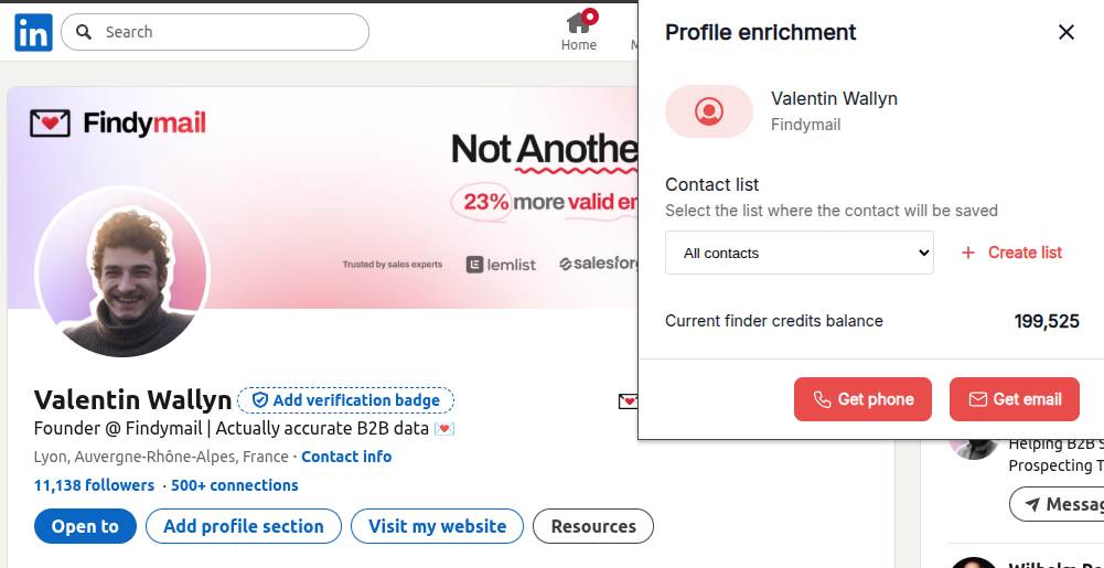 Once you find the lead you’re interested in or land on their profile, click the Findymail extension’s icon in your toolbar, and the tool will find their verified email address.