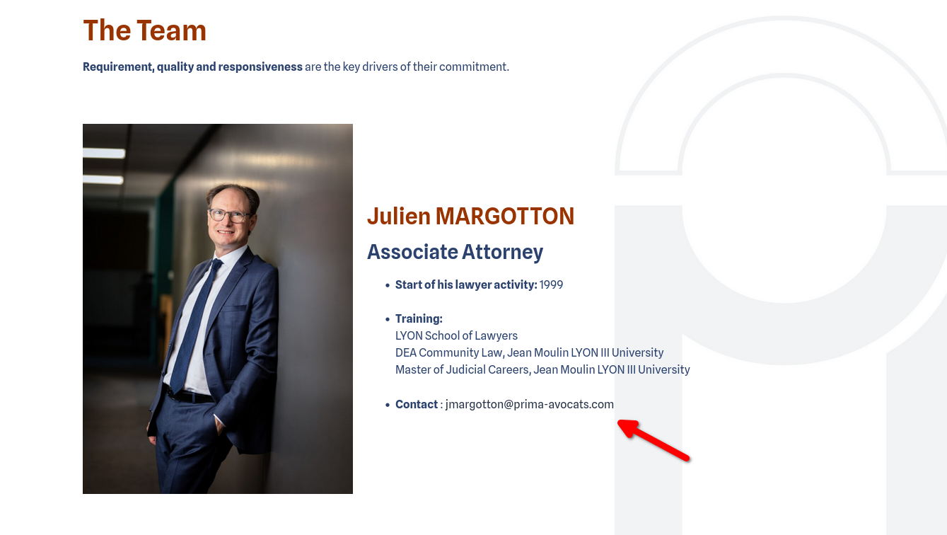 Not all organizations publicly list their email addresses, but there are cases where the CEO wants to appear super approachable, making it a lucky day for you. Usually, you’ll find the email address on the “About” or “Team” pages.