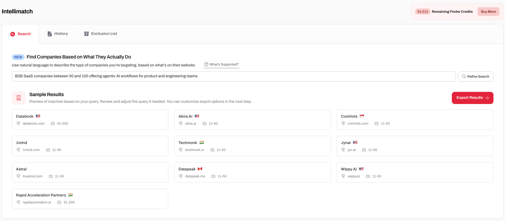 Let's say you're targeting the founder of âB2B SaaS companies between 10 and 50 employees offering agentic AI workflows for product and engineering teamsâ. Instead of filtering through a massive list of software companies and manually visiting every site to figure out which ones actually sell to product teams and use agentic AI, you describe your ideal lead in plain English. Intellimatch interprets your intent, searches across multiple data sources in real-time, and discovers leads that traditional databases would miss - including people who just changed roles last week.