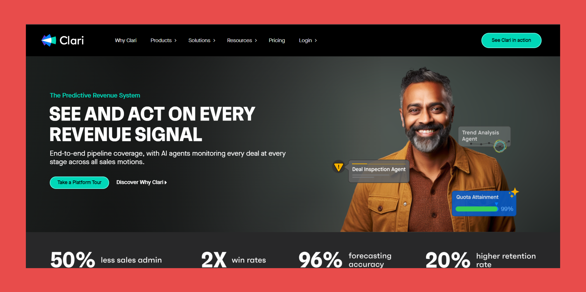 Clari combines outreach automation, pipeline insights, and AI-driven recommendations to help revenue teams generate pipeline and close deals more efficiently.